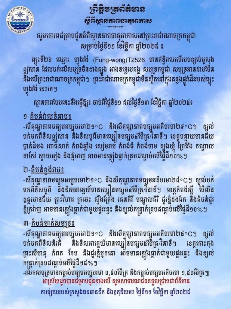 ស្ថានភាពធាតុអាកាស នៅកម្ពុជាចាប់ពីថ្ងៃទី១១ដល់ថ្ងៃទី១៣ខែវិច្ឆិកាឆ្នាំ២០២៥!