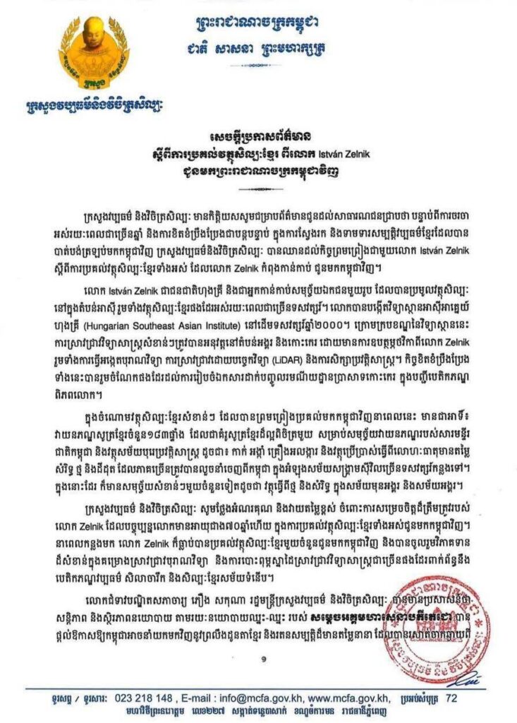 អនុវត្តតាមគោលការណ៍ដ៏ហ្មត់ចត់របស់រាជរដ្ឋាភិបាល ក្នុងនាមជាសេនាធិការផ្ទាល់ក្រសួងវប្បធម៌ និងវិចិត្រសិល្បៈ បានខិតខំប្រឹងប្រែងចរចាជាមួយលោក István Zelnik ជនជាតិហុងគ្រី និងរដ្ឋាភិបាលហុងគ្រី ដើម្បីនាំយករតនវត្ថុសិល្ប:ខ្មែរត្រឡប់មកកាន់មាតុភូមិវិញ។