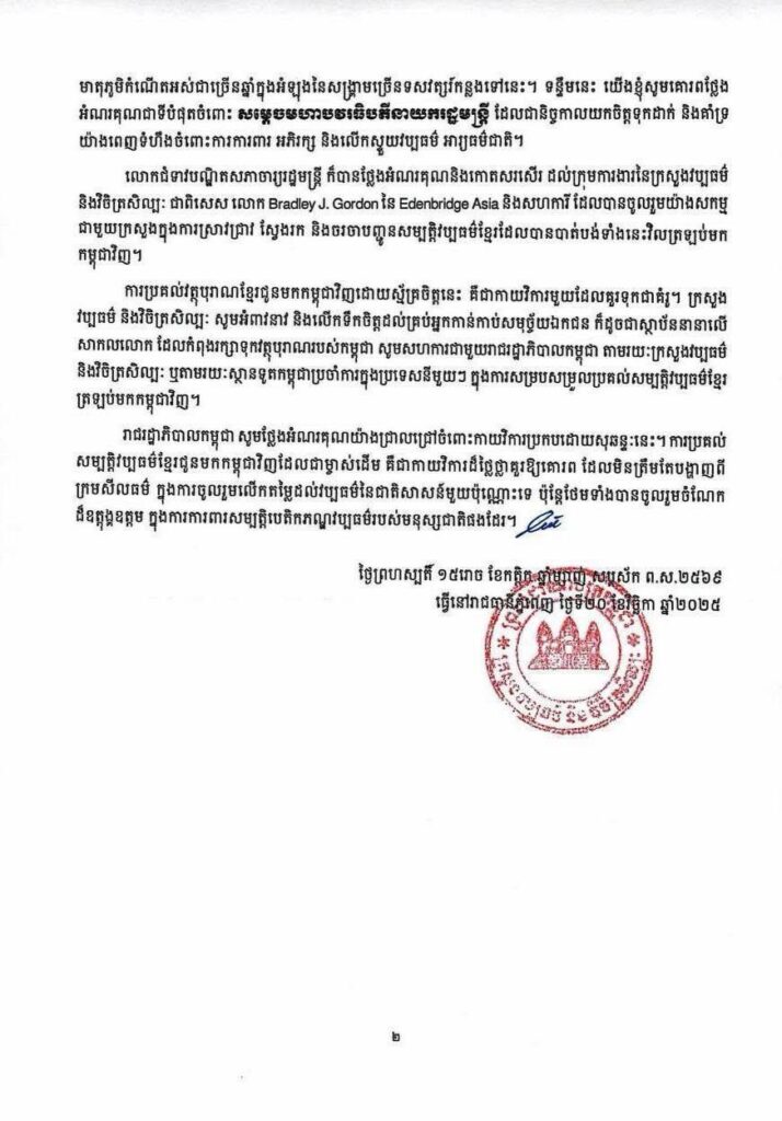 (ភ្នំពេញ)៖ នៅព្រឹកថ្ងៃទី២១ ខែវិច្ឆិកា ឆ្នាំ២០២៥ សម្តេចបវរធិបតី ហ៊ុន ម៉ាណែត នាយករដ្ឋមន្ត្រីនៃកម្ពុជា បានបង្ហោះសារអបអរសាទរ និងស្វាគមន៍រតនវត្ថុសិល្បៈខ្មែរ មាតុភូមិនិវត្តន៍មកកម្ពុជាវិញ។