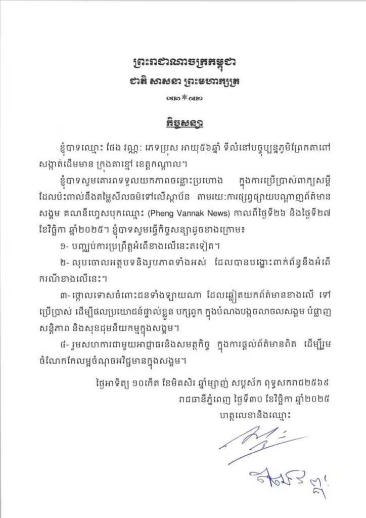 ដោយលោក ផែង វណ្ណៈ ធ្វើកិច្ចសន្យាបញ្ឈប់ការជេរប្រមាថ និងសកម្មភាពខុសឆ្គងតទៅទៀត ខណៈកងរាជអាវុធហត្ថលើផ្ទៃប្រទេស ក៏ព្រមទទួលយកផងដែរ!។