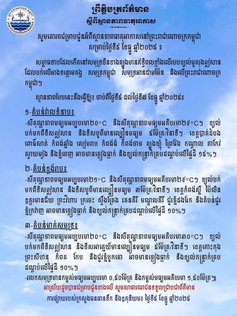 ស្ថានភាពធាតុអាកាស នៅកម្ពុជាចាប់ពីថ្ងៃទី៥ដល់ថ្ងៃទី៧ខែធ្នូឆ្នាំ២០២៥!