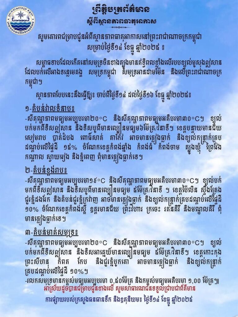 ស្ថានភាពធាតុអាកាស នៅកម្ពុជាចាប់ពីថ្ងៃទី១៤ដល់ថ្ងៃទី១៦ខែធ្នូឆ្នាំ២០២៥!