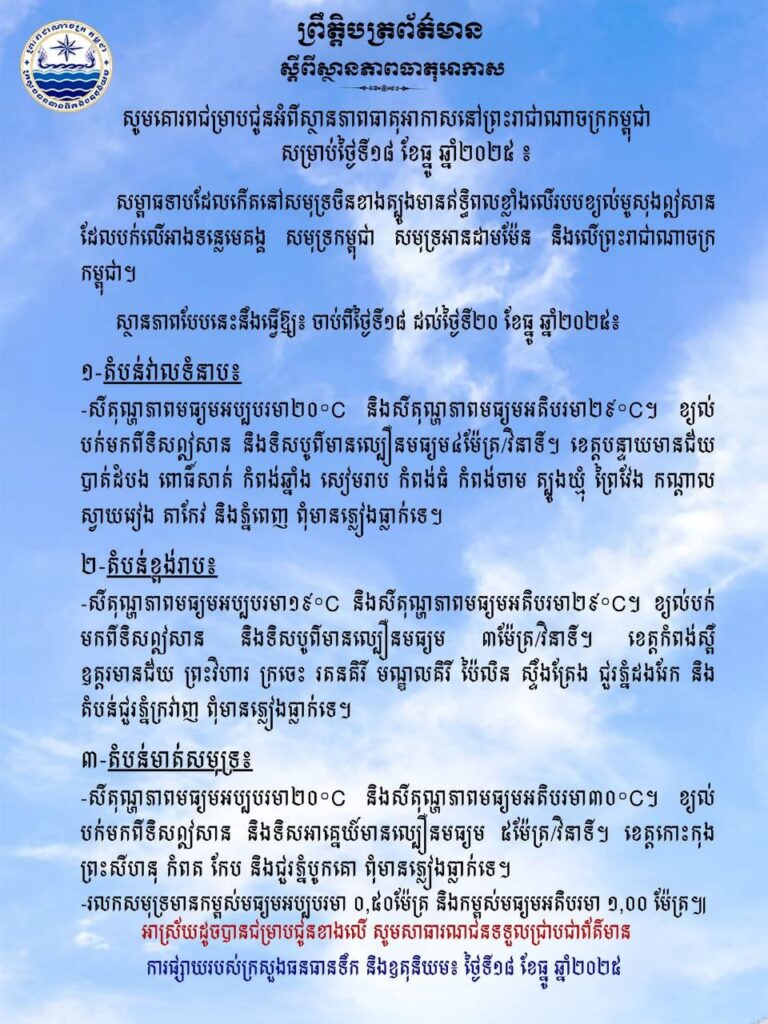 (ភ្នំពេញ)៖ ក្រសួងធនធានទឹក និងឧតុនិយម បានចេញសេចក្តីជូនដំណឹង អំពីស្ថានភាពធាតុអាកាសនៅកម្ពុជា សម្រាប់ថ្ងៃទី១៨ខែធ្នូឆ្នាំ២០២៥។