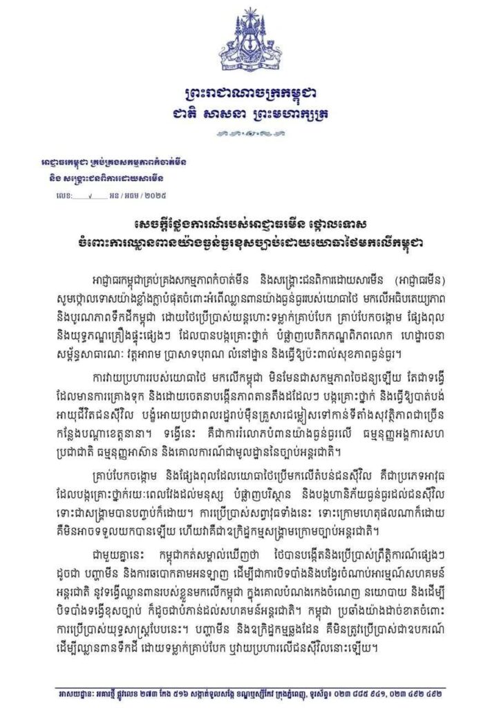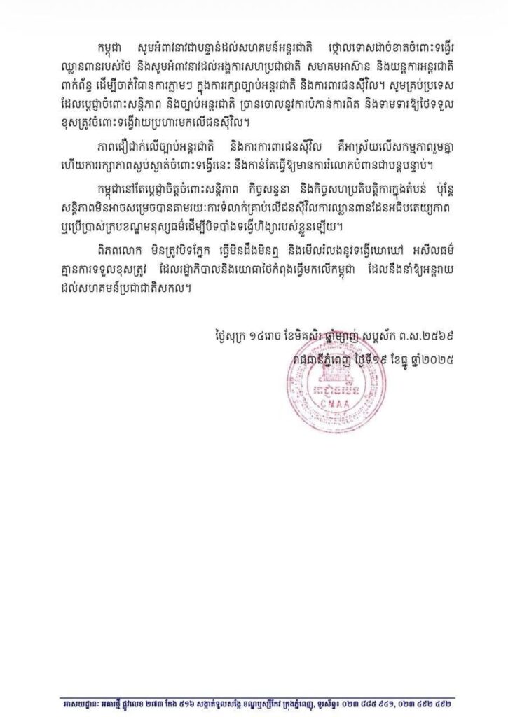 (ភ្នំពេញ)៖ អាជ្ញាធរមីនកម្ពុជា នៅថ្ងៃទី១៩.១២.២០២៥ បានចេញសេចក្ដីថ្លែងការណ៍មួយ។