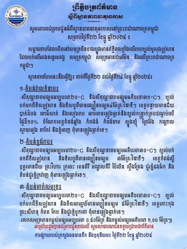 ស្ថានភាពធាតុអាកាស នៅកម្ពុជាចាប់ពីថ្ងៃទី២២ដល់ថ្ងៃទី២៤ខែធ្នូឆ្នាំ២០២៥!