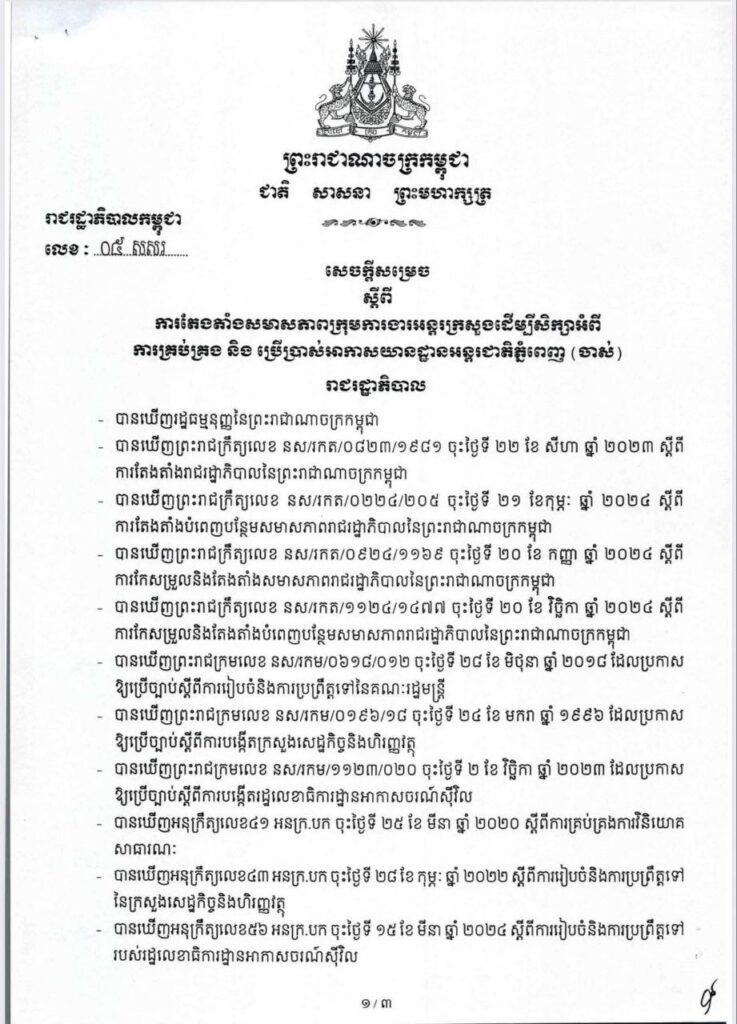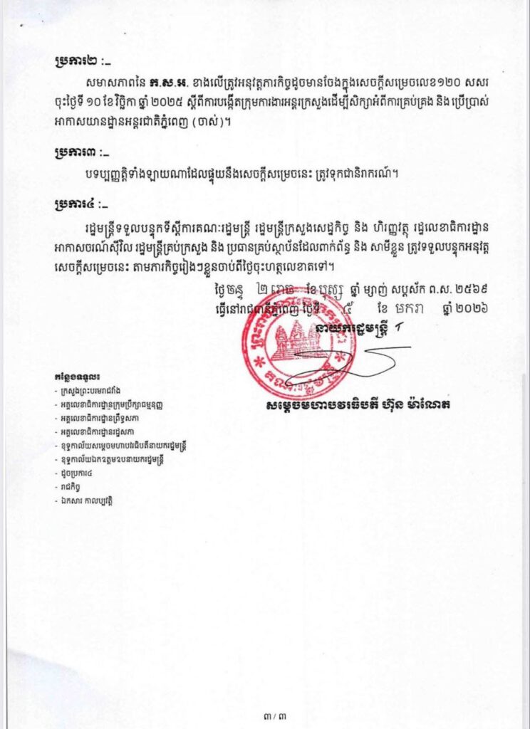 (ភ្នំពេញ)៖ សម្តេចធិបតី ហ៊ុន ម៉ាណែត នាយករដ្ឋមន្ត្រីនៃកម្ពុជា នៅថ្ងៃទី០៥.០១.២០២៦ បានចេញសេចក្តីសម្រេចស្តីពី ការតែងតាំងសមាសភាពក្រុមការងារអន្តរក្រសួង ដើម្បីសិក្សាអំពីការគ្រប់គ្រង និងប្រើប្រាស់អាកាសយានដ្ឋានអន្តរជាតិភ្នំពេញ(ចាស់)។