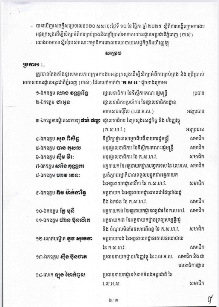 នៅក្នុងសេចក្តីសម្រេចនោះ បានតែងតាំងនូវសមាសភាពក្រុមការងារអន្តរក្រសួងដើម្បីសិក្សាអំពីការគ្រប់គ្រង និងប្រើប្រាស់ អាកាសយានដ្ឋានអន្តរជាតិភ្នំពេញ (ចាស់) ដែលហៅកាត់ថា“ក.ស.អ.” ដែលមានលោក ឈាង វណ្ណារិទ្ធ រដ្ឋលេខាធិការ នៃទីស្តីការគណៈរដ្ឋមន្ត្រី ជាប្រធាន អមដោយអនុប្រធាន និងសមាជិកជាច្រើនរូបទៀត៕