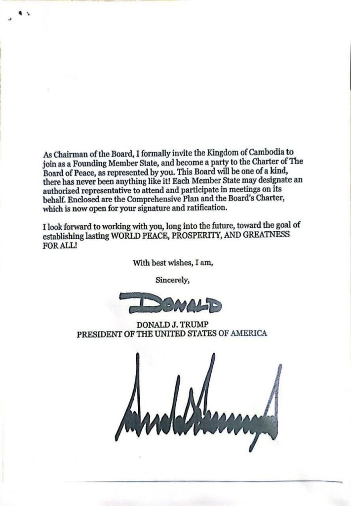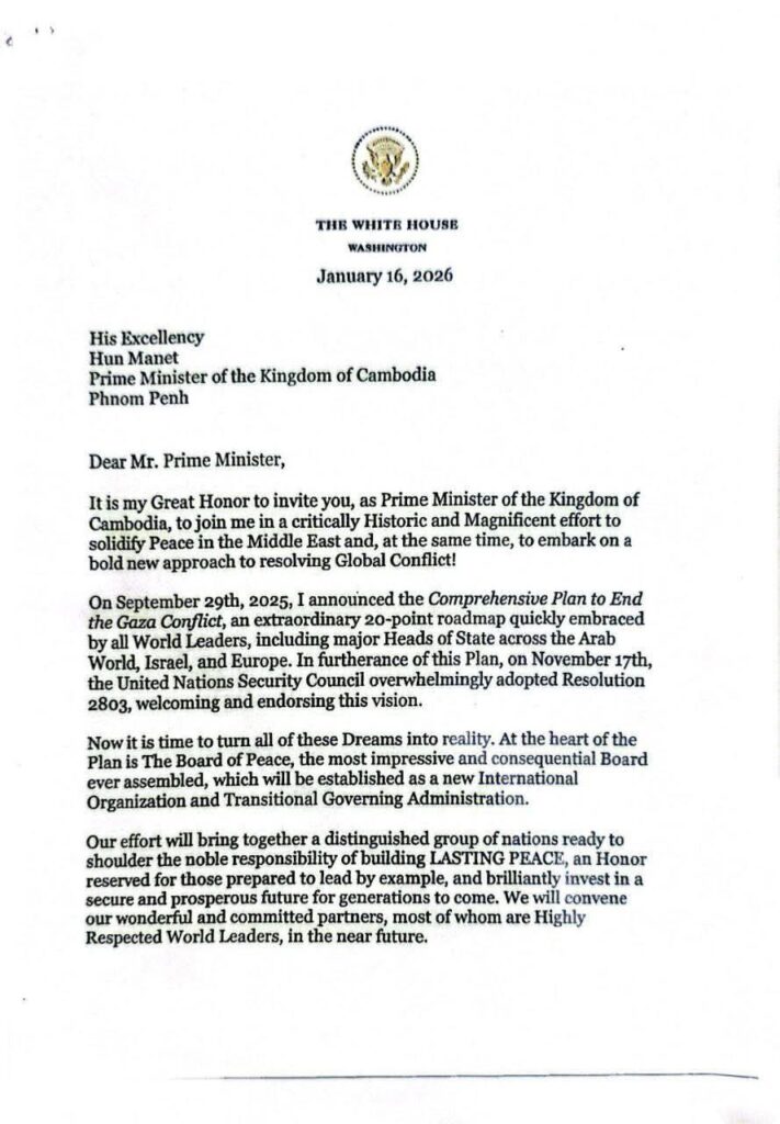 (ភ្នំពេញ)៖ លោក ដូណាល់ ត្រាំ ប្រធានាធិបតីសហរដ្ឋអាមេរិក បានផ្ញើលិខិតជូនសម្តេចមហាបវរធិបតី ហ៊ុន ម៉ាណែត នាយករដ្ឋមន្រ្តីនៃព្រះរាជាណាចក្រកម្ពុជា ដេីម្បីអញ្ជើញកម្ពុជា ចូលរួមជារដ្ឋសមាជិកស្ថាបនិក នៃក្រុមប្រឹក្សាសន្តិភាព និងជាភាគីនៃធម្មនុញ្ញរបស់ក្រុមប្រឹក្សាសន្តិភាព៕