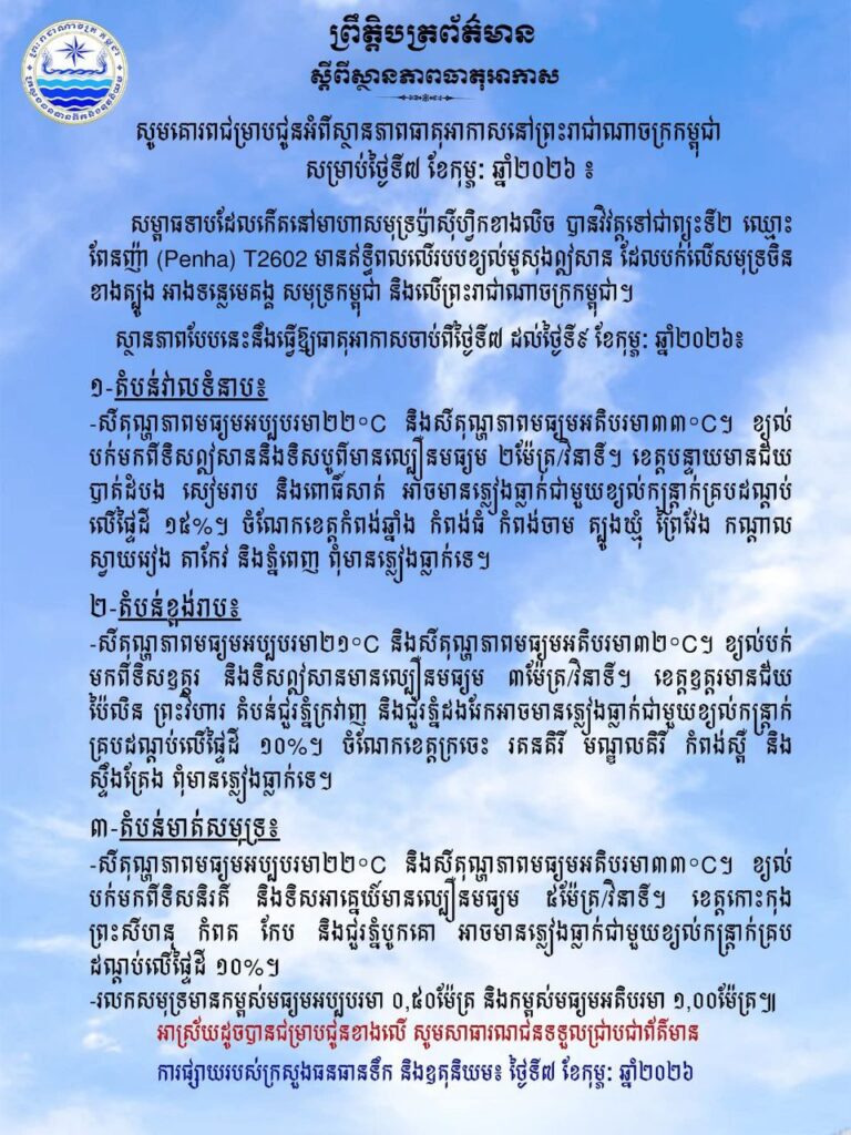 (ភ្នំពេញ)៖ ក្រសួងធនធានទឹក និងឧតុនិយម បានចេញសេចក្តីជូនដំណឹង អំពីស្ថានភាពធាតុអាកាសនៅកម្ពុជា សម្រាប់ថ្ងៃទី៧ខែកុម្ភៈឆ្នាំ២០២៦
