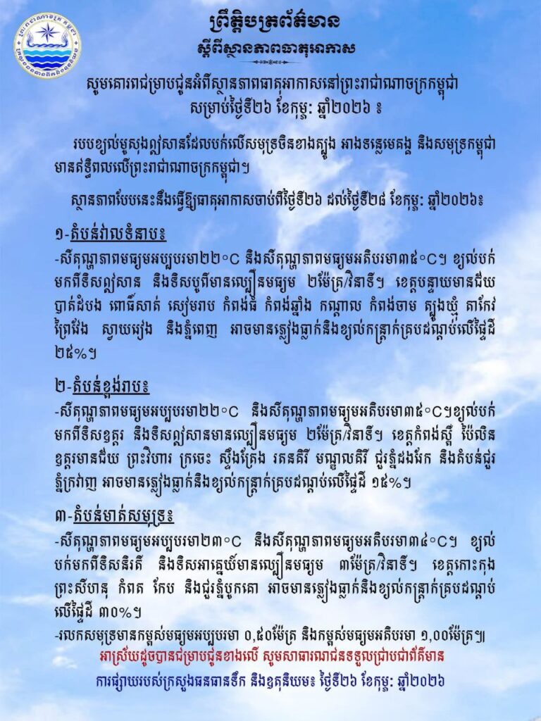 ស្ថានភាពធាតុអាកាស នៅកម្ពុជាចាប់ពីថ្ងៃទី២៦ដល់ថ្ងៃទី២៨ខែកុម្ភៈឆ្នាំ២០២៦!