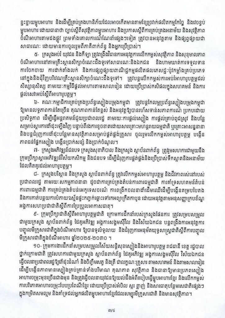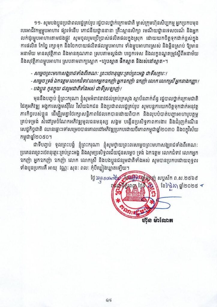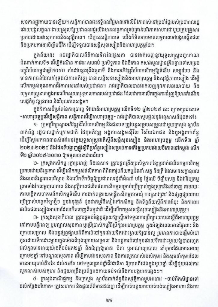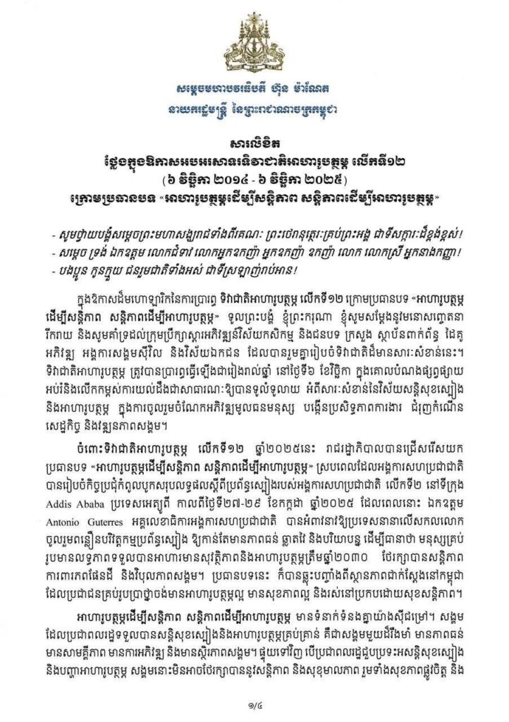 (ភ្នំពេញ)៖ យោងតាមសារលិខិតអបអរសាទរទិវាជាតិអាហារូបត្ថម្ភលើកទី១២ (៦ វិច្ឆិកា ២០១៤ – ៦ វិច្ឆិកា ២០២៥) ក្រោមប្រធានបទអាហារូបត្ថម្ភដើម្បីសន្តិភាព សន្តិភាពដើម្បីអាហារូបត្ថម្ភ។ សម្តេចធិបតី ហ៊ុន ម៉ាណែត បានគូសបញ្ជាក់ថា រាជរដ្ឋាភិបាលបានជ្រើសរើសប្រធានបទខាងលើនេះស្របពេលដែលអង្គការសហប្រជាជាតិ បានរៀបចំកិច្ចប្រជុំកំពូលបូកសរុបលទ្ធផលស្តីពីប្រព័ន្ធស្បៀងរបស់អង្គការសហប្រជាជាតិលើកទី២ នៅទីក្រុង Addis Ababa ប្រទេសអេត្យូពី កាលពីថ្ងៃទី២៧-២៩ ខែកក្កដា ឆ្នាំ២០២៥ ដែលពេលនោះ ឯកឧត្តម Antonio Guterres អគ្គលេខាធិការអង្គការសហប្រជាជាតិ បានអំពាវនាវឱ្យប្រទេសនានាលើសកលលោកចូលរួមពន្លឿន បរិវត្តកម្មប្រព័ន្ធស្បៀងឱ្យកាន់តែមានភាពធន់ ឆ្លាតវៃនិងបរិយាបន្នដើម្បីធានាថា មនុស្សគ្រប់រូបមានលទ្ធភាពទ ទួលបានអាហារមានសុវត្ថិភាព និងអាហារូបត្ថម្ភត្រឹមឆ្នាំ២០៣០ ថែរក្សាបានសន្តិភាព ការពារភពផែនដីនិងវិបុ លភាពសង្គម។