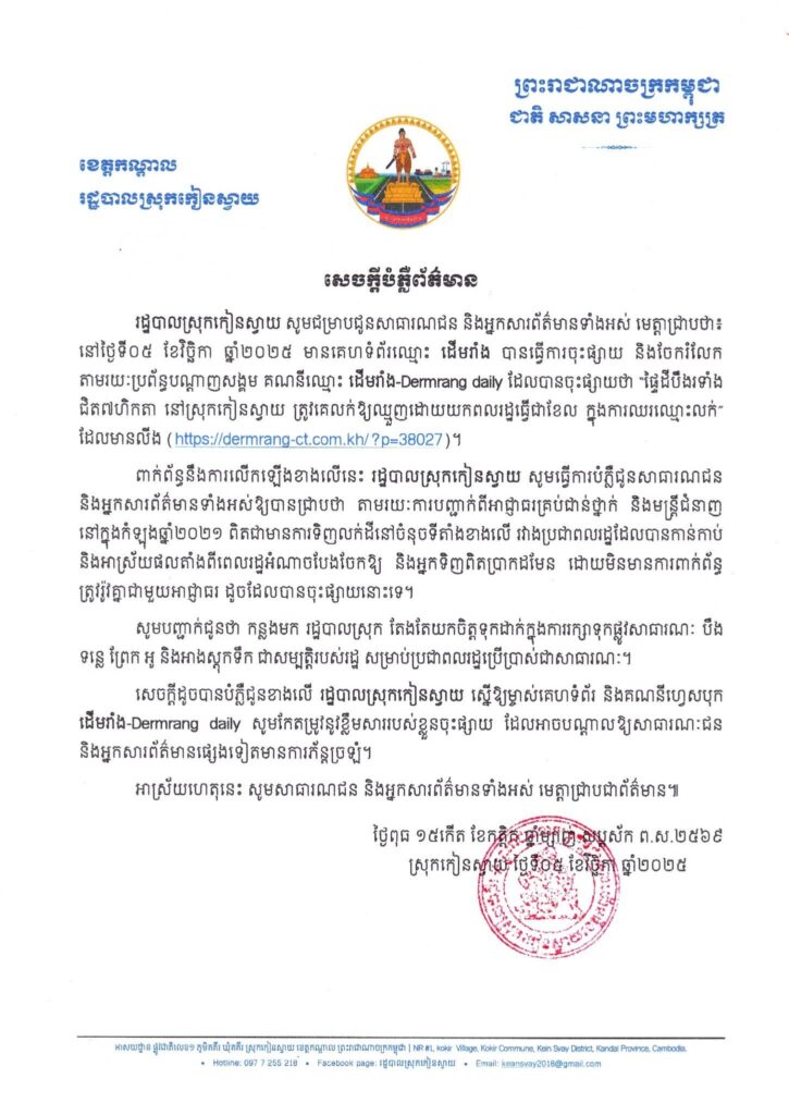 -ចំណុចទី៣៖ រដ្ឋបាលស្រុកកៀនស្វាយ ស្នើឱ្យ”ដើមរាំង”ចុះផ្សាយកែតម្រូវឡើងវិញ!!។