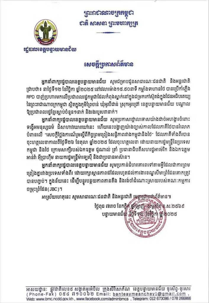 *នេះបើយោងតាម សេចក្ដីប្រកាសព័ត៌មាន របស់អ្នកនាំពាក្យរដ្ឋបាលខេត្តបន្ទាយមានជ័យ។