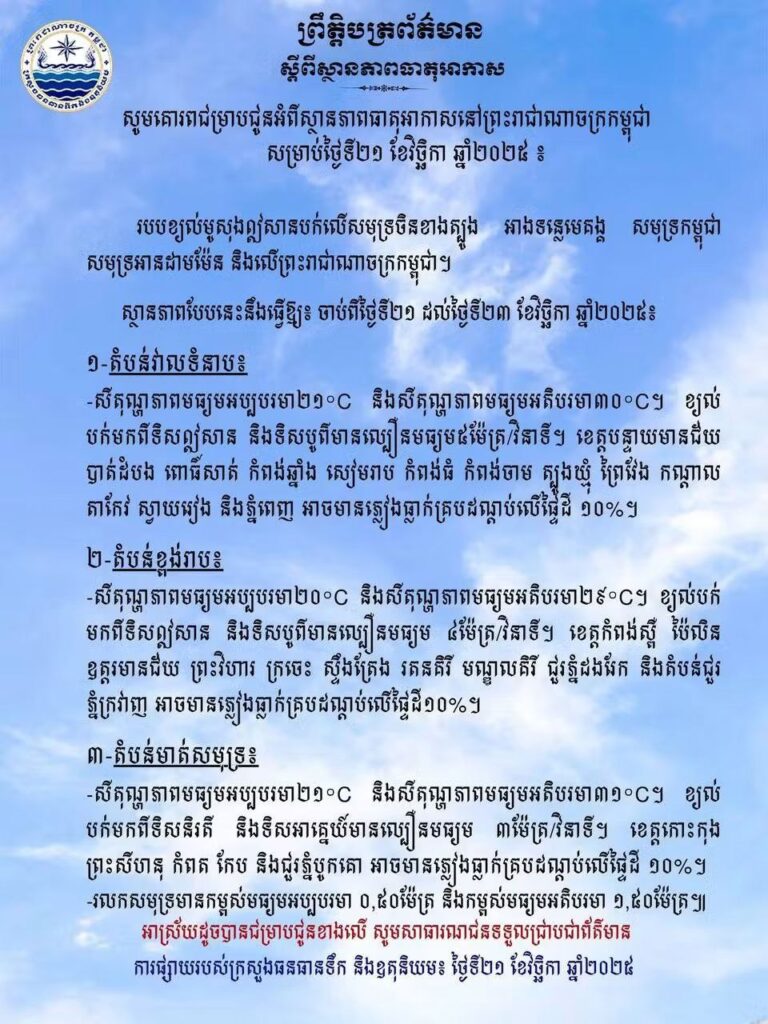 ខ្យល់មូសុងឦសានដែលបក់ លើសមុទ្រចិនខាងត្បូងចាប់ផ្តើមមានឥទ្ធិពល ខណៈសម្ពាធ ទាប បន្តគ្របដណ្តប់លើភាគខាងក្រោមនៃអាងទន្លេមេគង្គ និងលើព្រះរាជាណាចក្រកម្ពុជា។ស្ថានភាព បែបនេះនឹងធ្វើឱ្យ៖ ចាប់ពីថ្ងៃទី២១ដល់ថ្ងៃទី២៣ខែវិច្ឆិកាឆ្នាំ២០២៥