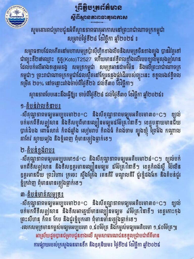(ភ្នំពេញ)៖ ក្រសួងធនធានទឹក និងឧតុនិយម បានចេញសេចក្តីជូនដំណឹង អំពីស្ថានភាពធាតុអាកាសនៅកម្ពុជា សម្រាប់ថ្ងៃទី២៨ខែវិច្ឆិកាឆ្នាំ២០២៥។