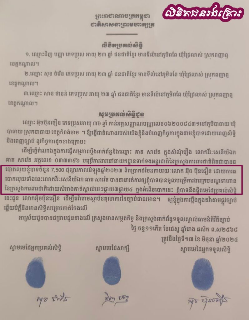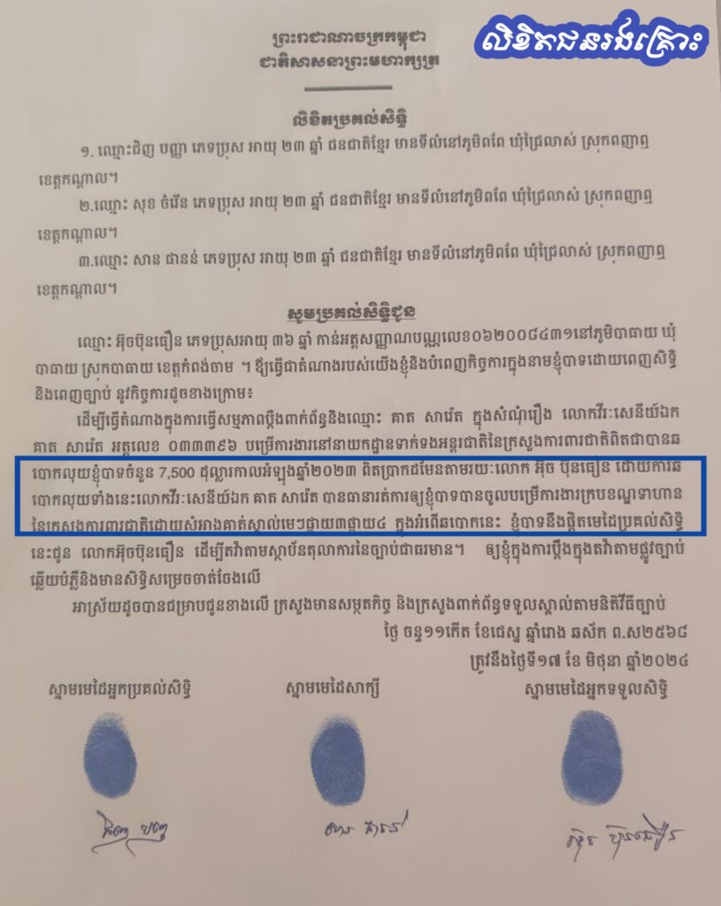 (ភ្នំពេញ)៖ ពលរដ្ឋចំនួន៣នាក់ អះអាងដូចៗគ្នាថា ខ្លួនបានចាញ់បោកលោកវរសេនីយ៍ឯក គាត សារ៉េត អត្តលេខ ០៣៣៣៩៦ សមាជិកក្រុមស្រាវជ្រាវ យុទ្ធសាស្ត្រយោធា នៃក្រសួងការពារជាតិ អស់ម្នាក់ៗចំនួន៧.៥០០ដុល្លារ សរុបទាំង៣នាក់ចំនួន២២.៥០០ដុល្លារ ជាថ្នូរនឹងរត់ការចូលក្របខ័ណ្ឌទាហាន នៃក្រសួងការពារជាតិ។