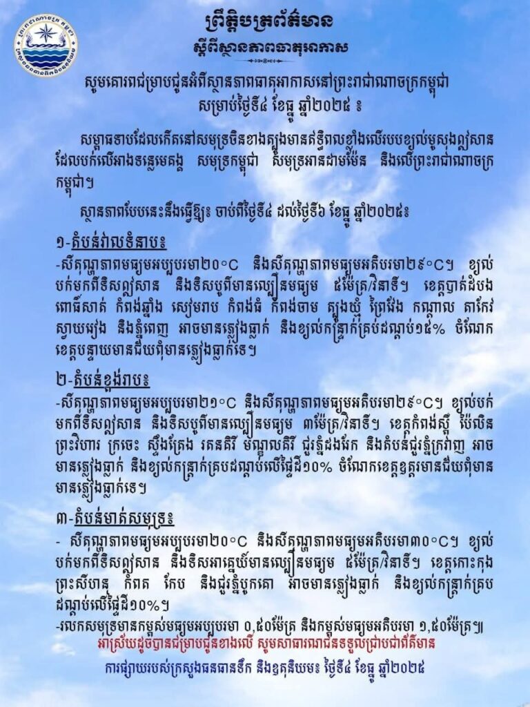 ខ្យល់មូសុងឦសានដែលបក់ លើសមុទ្រចិនខាងត្បូងចាប់ផ្តើមមានឥទ្ធិពល ខណៈសម្ពាធ ទាប បន្តគ្របដណ្តប់លើភាគខាងក្រោមនៃអាងទន្លេមេគង្គ និងលើព្រះរាជាណាចក្រកម្ពុជា។ស្ថានភាព បែបនេះនឹងធ្វើឱ្យ៖ ចាប់ពីថ្ងៃទី៤ដល់ថ្ងៃទី៦ខែធ្នូឆ្នាំ២០២៥