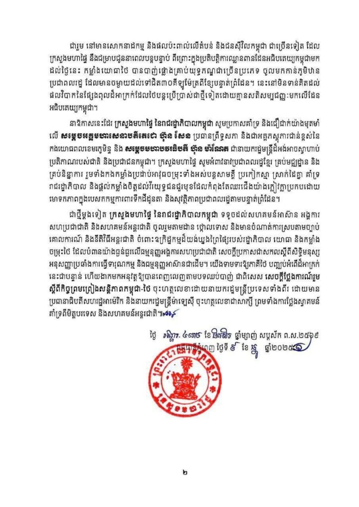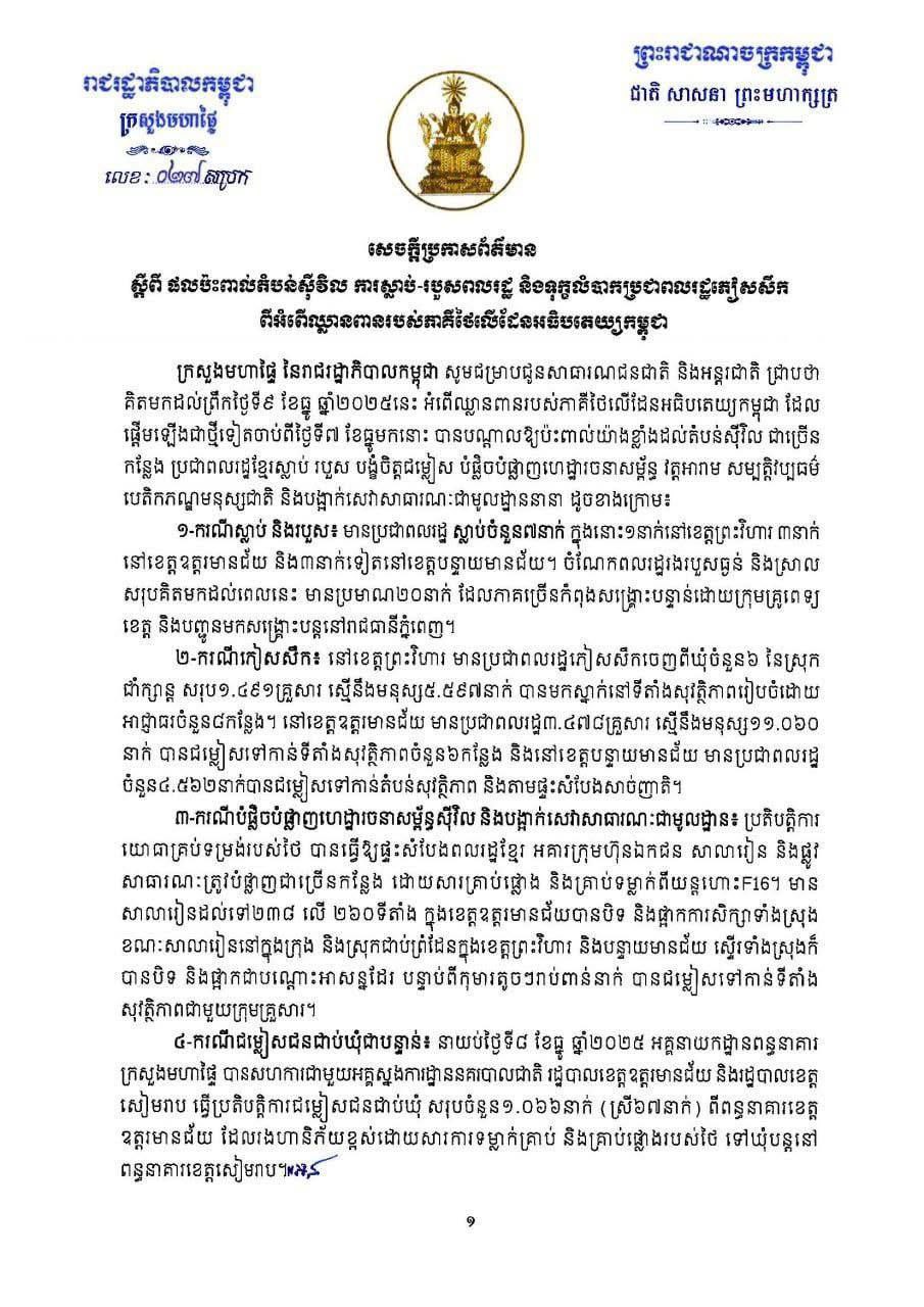 (ភ្នំពេញ)៖ ក្រសួងមហាផ្ទៃ នៅថ្ងៃទី០៩.១២.២០២៥ បានលើកឡើងថា ពលរដ្ឋខ្មែរស្លាប់ចំនួន៧នាក់ និងរបួស២០នាក់ ដោយសារការវាយប្រហារ ពីសំណាក់ទ័ពថៃ។