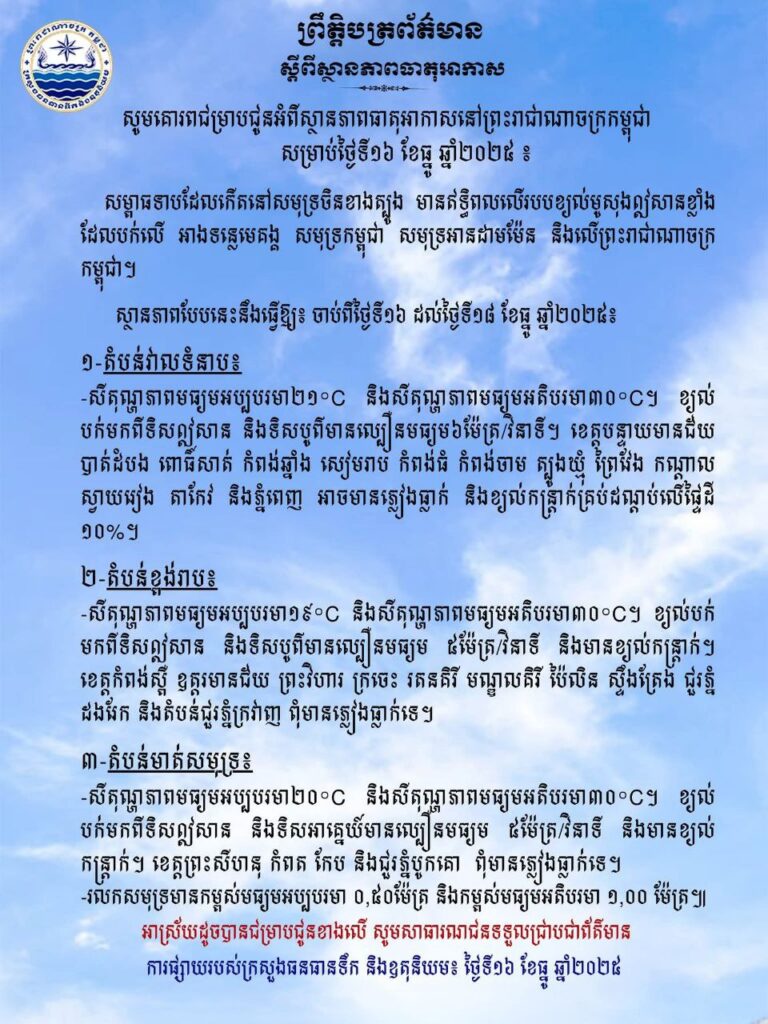 (ភ្នំពេញ)៖ ក្រសួងធនធានទឹក និងឧតុនិយម បានចេញសេចក្តីជូនដំណឹង អំពីស្ថានភាពធាតុអាកាសនៅកម្ពុជា សម្រាប់ថ្ងៃទី១៦ខែធ្នូឆ្នាំ២០២៥។
