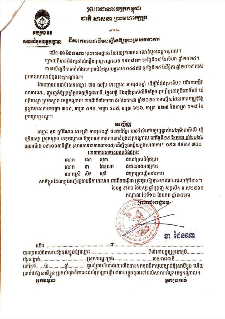 (កណ្តាល)៖ សាលាដំបូងខេត្តកណ្តាល នឹងបើកសវនាការជំនុំជម្រះក្ដីលើសំណុំរឿងព្រហ្មទណ្ឌលេខ ១៩០៨ អ.ក.ចុះថ្ងៃទី០៨ ខែសីហា ឆ្នាំ២០២៤។