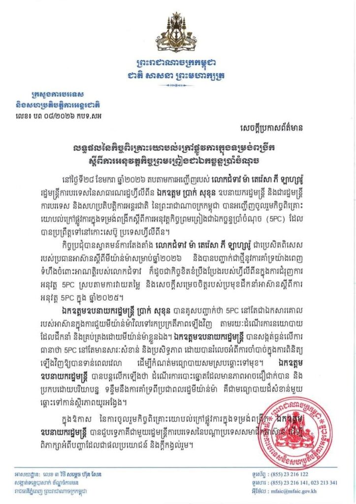 លោកឧបនាយករដ្ឋមន្ត្រី ប្រាក់ សុខុន បានគូសបញ្ជាក់ថា 5PC នៅតែជាឯកសារគោល របស់អាស៊ានក្នុងការជួយមីយ៉ាន់ម៉ាវិលទៅរកប្រក្រតីភាពឡើងវិញ តាមរយៈដំណើរការនយោបាយ ដែលដឹកនាំ និងគ្រប់គ្រងដោយមីយ៉ាន់ម៉ាខ្លួនឯង។