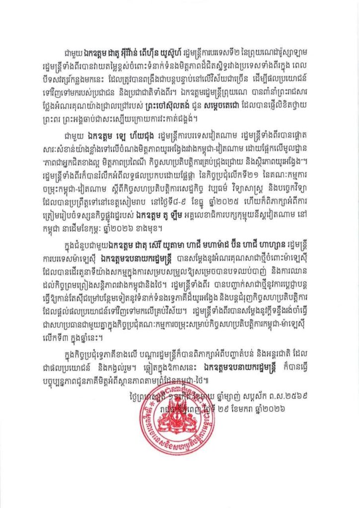 រដ្ឋមន្ត្រីទាំងពីរ ក៏បានរំលឹកអំពីលទ្ធផលប្រកបដោយផ្លែផ្កា នៃកិច្ចប្រជុំលើកទី២១ នៃគណៈកម្មការ ចម្រុះកម្ពុជា-វៀតណាម ស្តីពីកិច្ចសហប្រតិបត្តិការសេដ្ឋកិច្ច វប្បធម៌ វិទ្យាសាស្ត្រ និងបច្ចេកវិទ្យា ដែលបានប្រព្រឹត្តទៅនៅខេត្តសៀមរាប នៅថ្ងៃទី៨-៩ ខែធ្នូ ឆ្នាំ២០២៥ ហើយក៏ពិភាក្សាអំពីការ ត្រៀមរៀបចំទស្សនកិច្ចផ្លូវរដ្ឋរបស់ លោក តូ ឡឺម អគ្គលេខាធិការបក្សកុម្មុយនីស្តវៀតណាម នៅកម្ពុជា នាដើមខែកុម្ភៈ ឆ្នាំ២០២៦ ខាងមុខ។