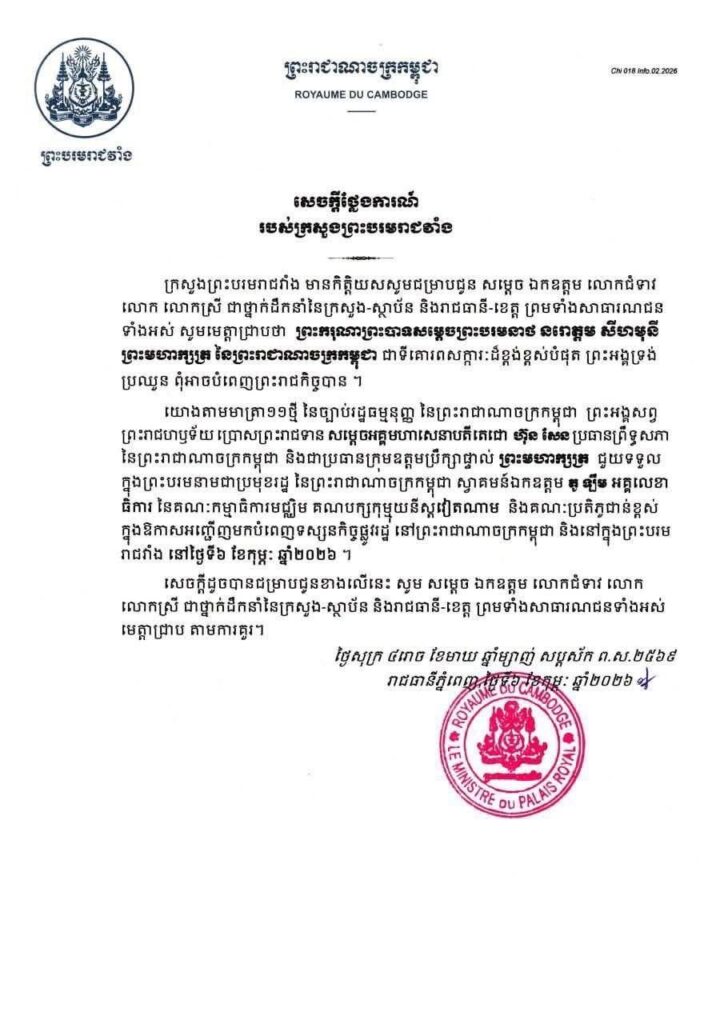 (ភ្នំពេញ)៖ ក្រសួងព្រះបរមរាជវាំង នៅព្រឹកថ្ងៃទី៦ ខែកុម្ភៈ ឆ្នាំ២០២៦ បានចេញសេចក្តីថ្លែងការណ៍ដោយបញ្ជាក់ថា ព្រះមហាក្សត្រកម្ពុជា ព្រះអង្គទ្រង់ប្រឈួន ពុំអាចបំពេញព្រះរាជកិច្ចបាន ប្រគល់ភារកិច្ចជូនសម្តេចតេជោ ហ៊ុន សែន ជាប្រមុខរដ្ឋឱ្យទទួលស្វាគមន៍លោក តូ ឡឹម អគ្គលេខាធិការគណបក្សកុម្មុយនីស្តវៀតណាម នៅក្នុងព្រះបរមរាជវាំង។