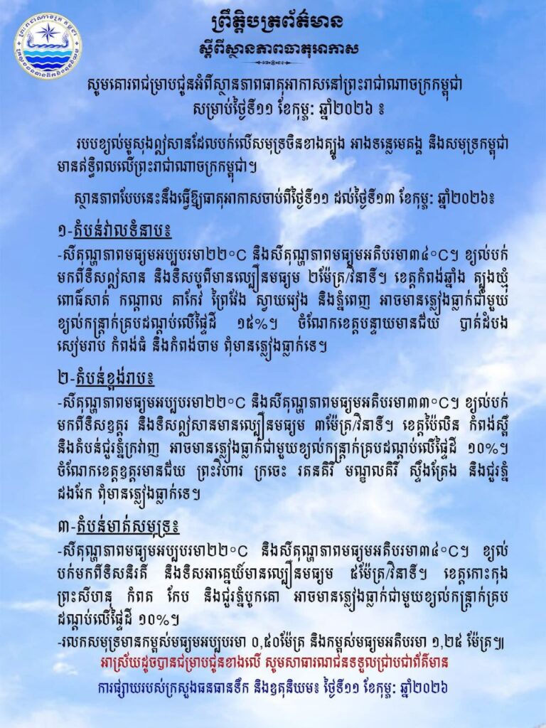 (ភ្នំពេញ)៖ ក្រសួងធនធានទឹក និងឧតុនិយម បានចេញសេចក្តីជូនដំណឹង អំពីស្ថានភាពធាតុអាកាសនៅកម្ពុជា សម្រាប់ថ្ងៃទី១១ខែកុម្ភៈឆ្នាំ២០២៦