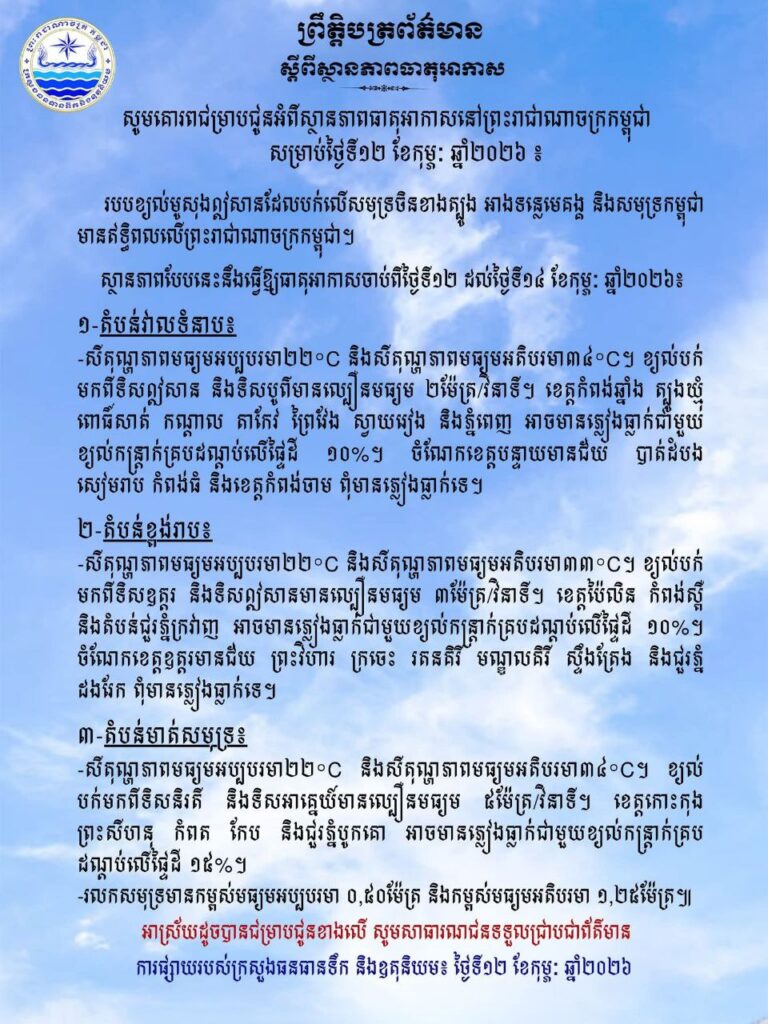 (ភ្នំពេញ)៖ ក្រសួងធនធានទឹក និងឧតុនិយម បានចេញសេចក្តីជូនដំណឹង អំពីស្ថានភាពធាតុអាកាសនៅកម្ពុជា សម្រាប់ថ្ងៃទី១២ខែកុម្ភៈឆ្នាំ២០២៦
