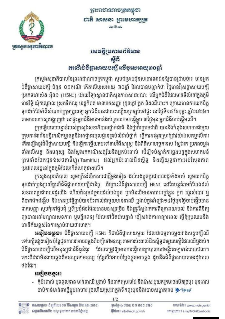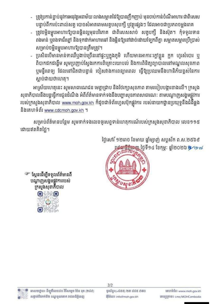 នេះបើយោងតាម សេចក្ដីប្រកាសព័ត៌មានរបស់ក្រសួងសុខាភិបាល នៅថ្ងៃទី១៤.០២.២០២៦៕