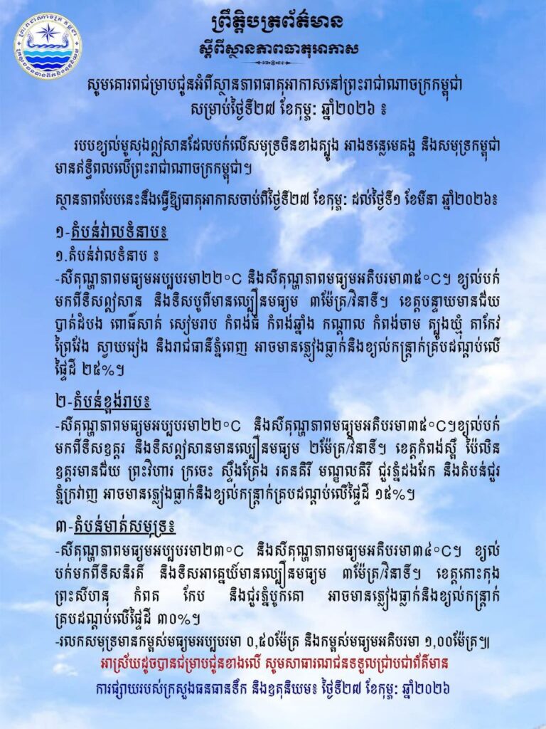 (ភ្នំពេញ)៖ ក្រសួងធនធានទឹក និងឧតុនិយម បានចេញសេចក្តីជូនដំណឹង អំពីស្ថានភាពធាតុអាកាសនៅកម្ពុជា សម្រាប់ថ្ងៃទី២៧ខែកុម្ភៈឆ្នាំ២០២៦