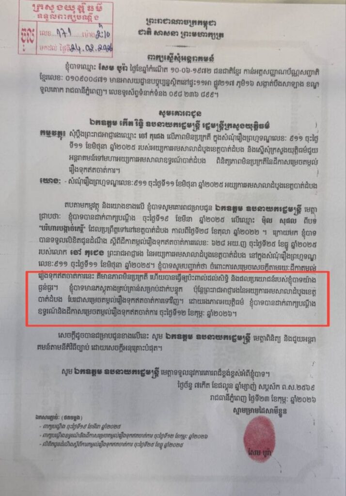 *នេះបើយោងតាម ពាក្យសុំអន្តរាគមន៍ ចុះថ្ងៃទី២៣ ខែកុម្ភៈ ឆ្នាំ២០២៦ និងពាក្យបណ្ដឹង ចុះថ្ងៃទី០៦ ខែមីនា ឆ្នាំ២០២៦។