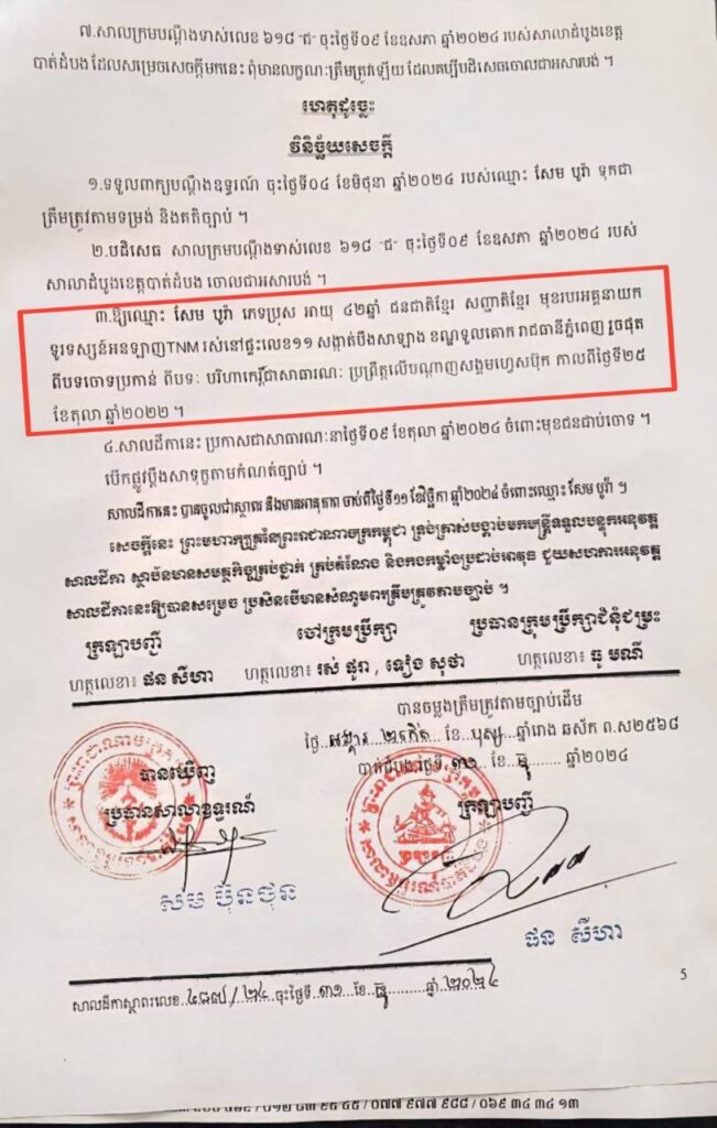 ទន្ទឹមនិងនោះ សាលាដំបូងខេត្តបាត់ដំបង បានចេញសាលក្រម លេខ ៦១៨ (ជ) ចុះថ្ងៃ ទី០៩ ខែឧសភា ឆ្នាំ២០២៤ ដោយសម្រេចតម្កល់សាលក្រមព្រហ្មទណ្ឌលេខ៩៤(ជ) ចុះថ្ងៃទី១១ ខែមករា ឆ្នាំ២០២៤ ទុកជាបានការដដែល!!។