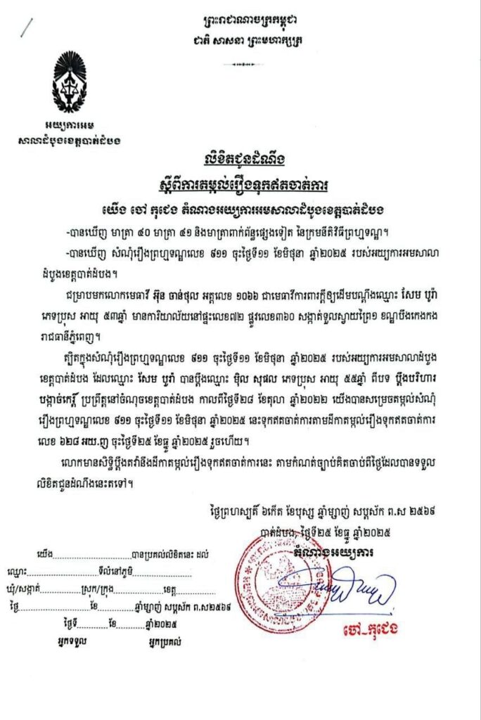 ស្រាប់តែលោក ចៅ កុជេង ព្រះរាជអាជ្ញារងខេត្តបាត់ដំបង ប្រើឆន្ទានុសិទ្ធិរបស់ខ្លួន ដោយសម្រេចតម្កល់រឿងទុកឥតចាត់ការ លើសំណុំរឿងព្រហ្មទណ្ឌលេខៈ ៩១១ ចុះថ្ងៃទី១១ ខែមិថុនា ឆ្នាំ២០២៥ ដែលមានលោក សែម បូរ៉ា ជាដើមបណ្ដឹង។